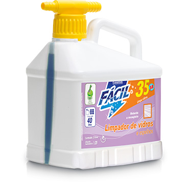 Fácil 35 SB foi especialmente desenvolvido para a limpeza de vidros, vidraças, cristais, vitrines, azulejos, parabrisas, podendo inclusive ser utilizado na limpeza de louças sanitárias, aço inox, fórmicas e superfícies plásticas e geral. Embalado em frascos de 2 litros, Fácil 35 SB possui um dosador automático incorporado em sua tampa, garantindo a diluição perfeita e melhores resultados. Diluição de 1:20. Cada frasco dosa, aproximadamente, 40 litros de solução limpadora.